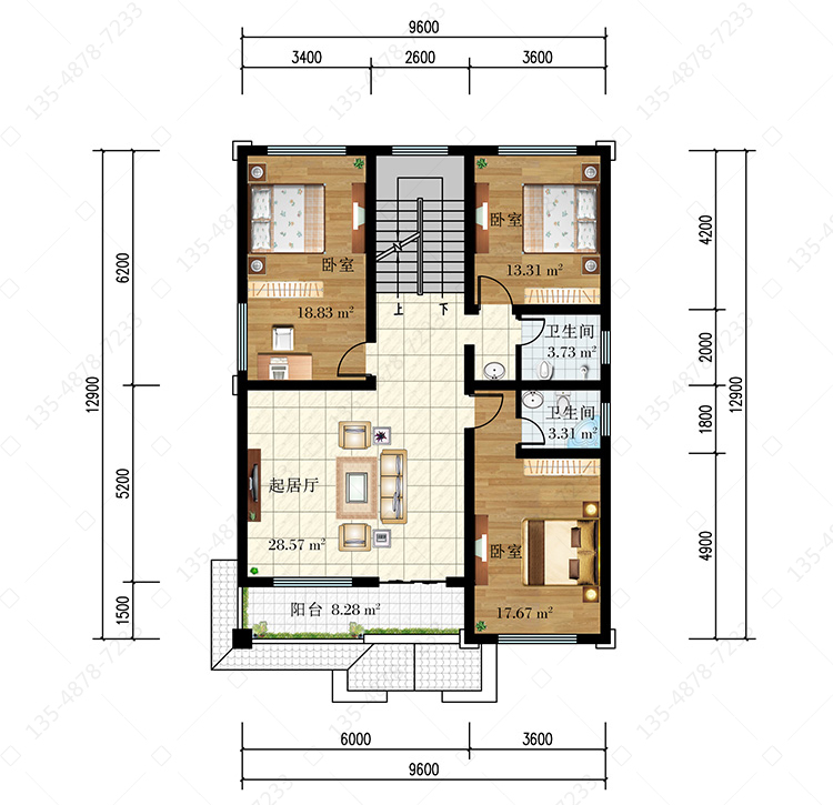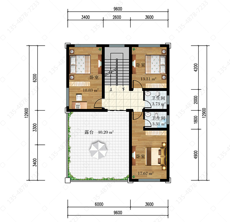 三 层:卧室(附卫生间)、2卧室、卫生间、露台