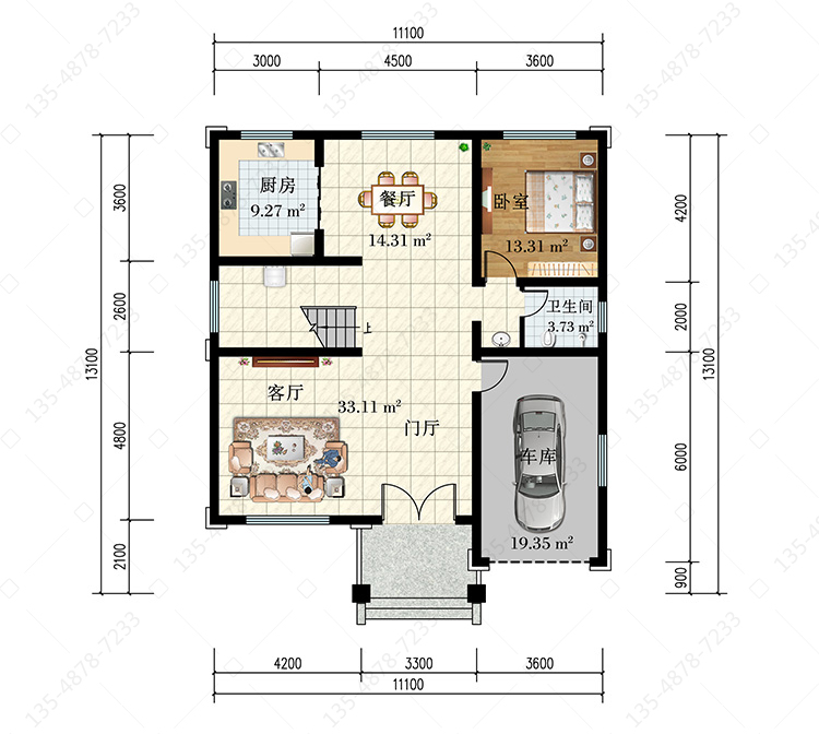 一 层:门厅、客厅、卧室、厨房、餐厅、卫生间、车库