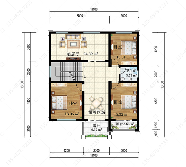 二 层:起居厅、棋牌区域、卧室(附阳台)、2卧室、卫生间、露台