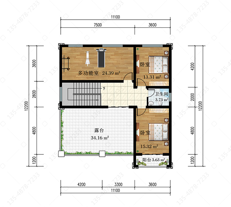 三 层:卧室(附阳台)、卧室、多功能室、卫生间、露台