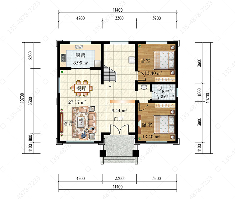 一 层:门厅、客厅(中空)、2卧室、厨房、餐厅、卫生间