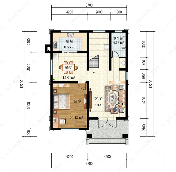 一 层:客厅、卧室、厨房、餐厅、卫生间