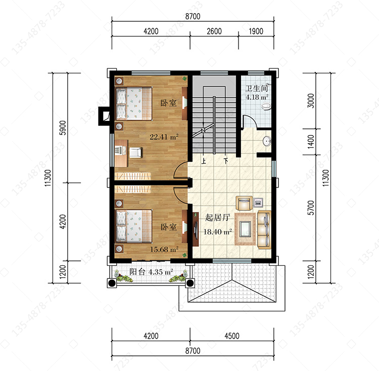 二 层:起居厅、卧室(附阳台)、卧室、卫生间