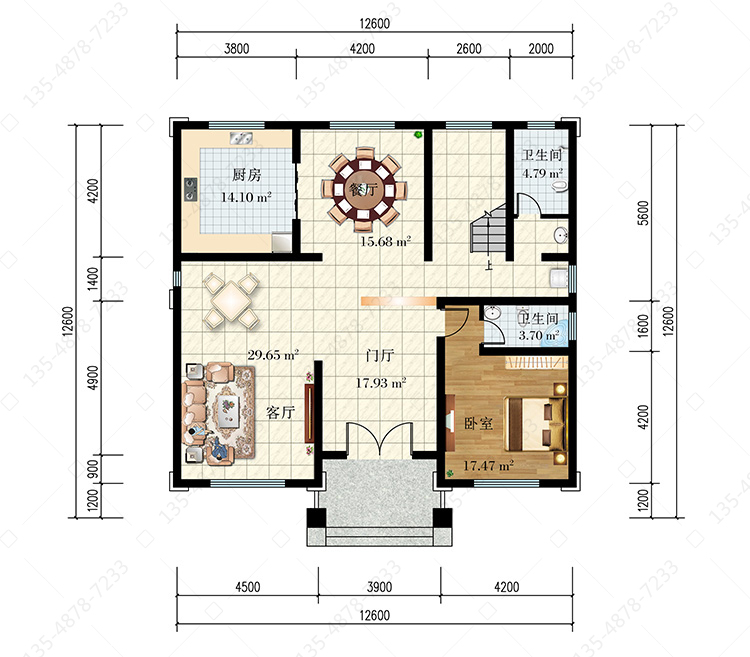 一 层:门厅、客厅(中空)、卧室(附卫生间)、厨房、餐厅、卫生间
