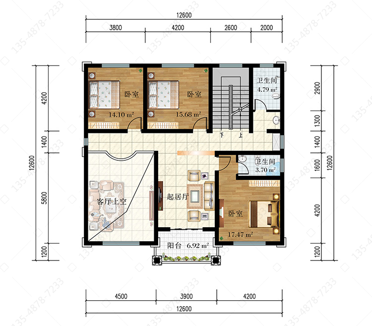 二 层:起居厅、卧室(附卫生间)、2卧室、卫生间、阳台