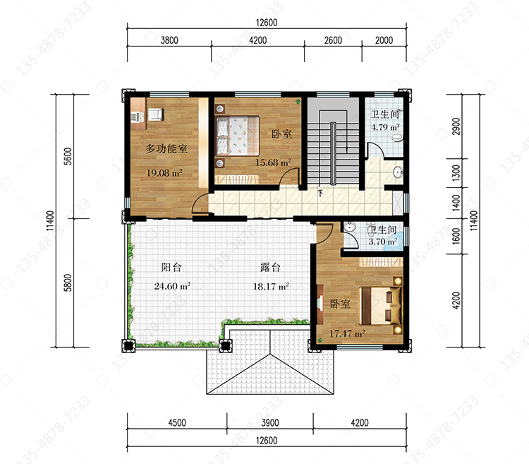 三 层:卧室(附卫生间)、卧室、多功能室、卫生间、阳台、露台