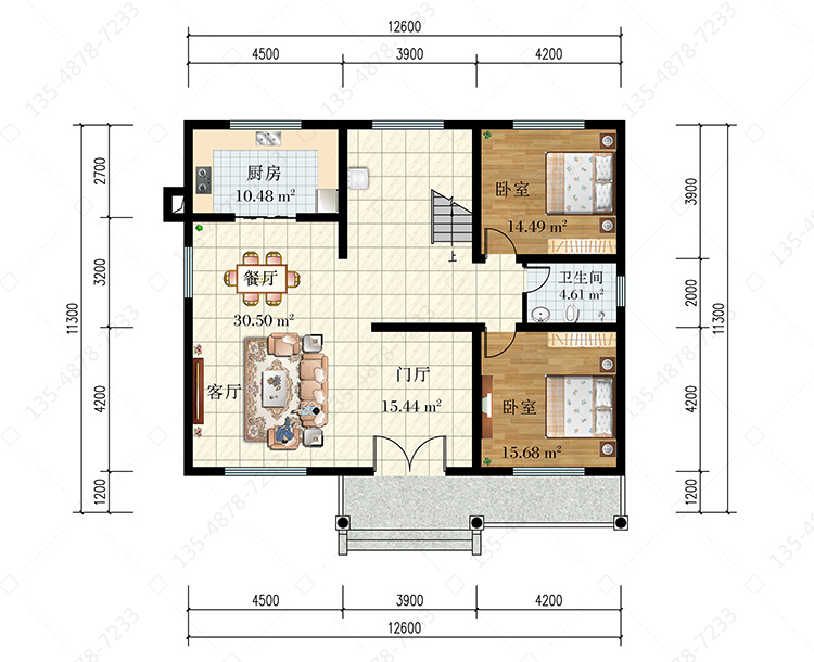 一 层:门厅、客厅、2卧室、厨房、餐厅、卫生间