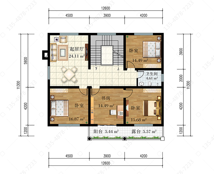二 层:起居厅、卧室(附书房、阳台、露台)、2卧室、卫生间