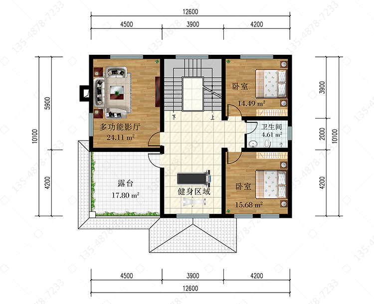 三 层:健身区域、2卧室、多功能影厅、卫生间、露台