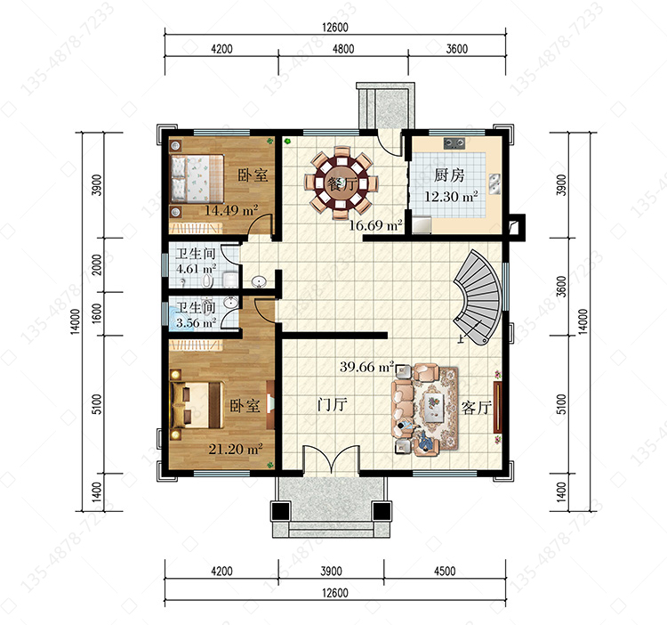 一 层:门厅、客厅(中空)、卧室(附卫生间)、卧室、厨房、餐厅、卫生间