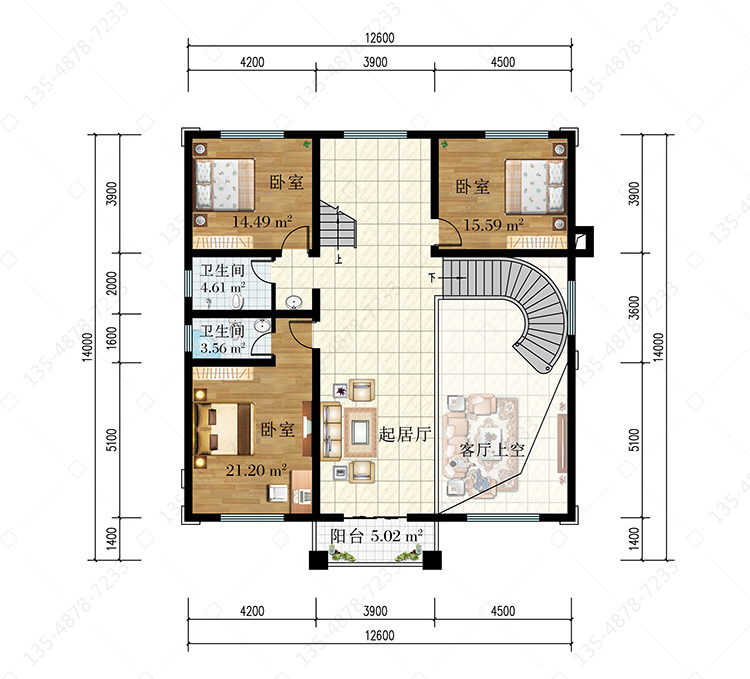 二 层:起居厅、卧室(附卫生间)、2卧室、卫生间、阳台