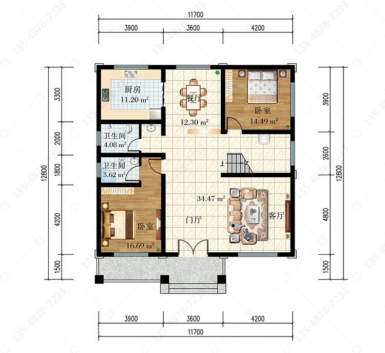 一 层:门厅、客厅(中空)、卧室(附卫生间)、卧室、厨房、餐厅、卫生间