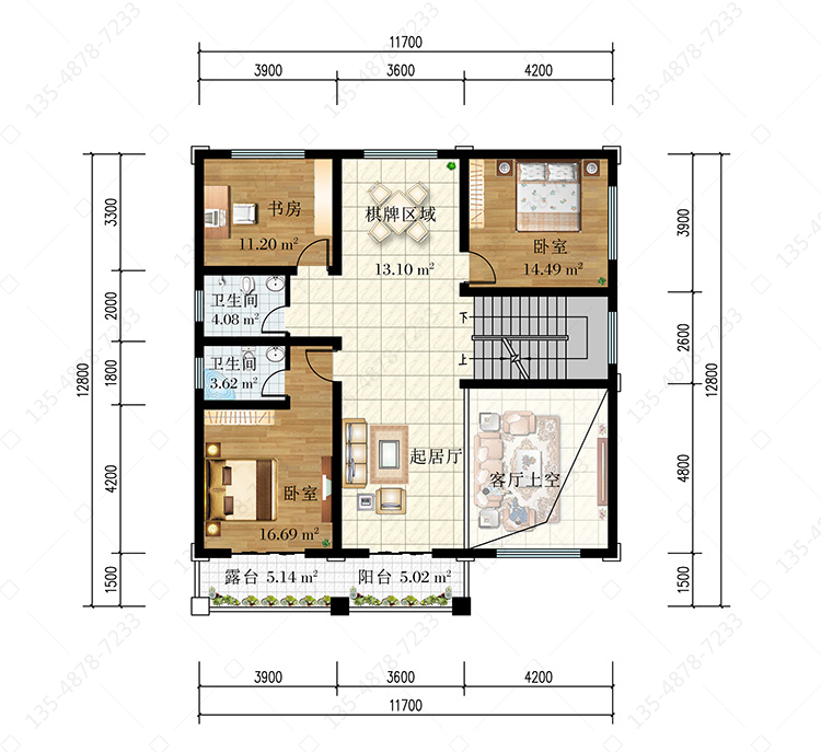 二 层:起居厅、棋牌区域、卧室(附卫生间、露台)、卧室、书房、卫生间、阳台