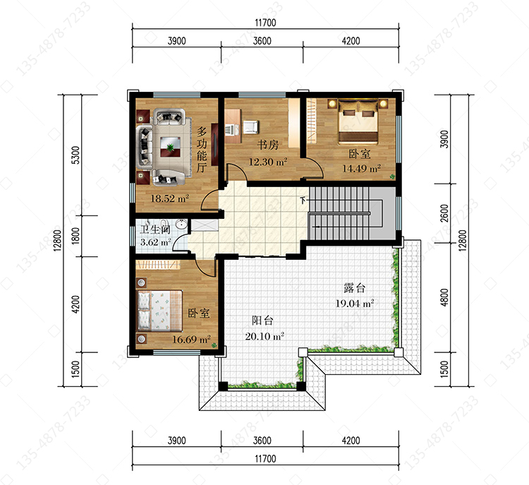 三 层:卧室(附书房)、卧室、多功能厅、卫生间、阳台、露台