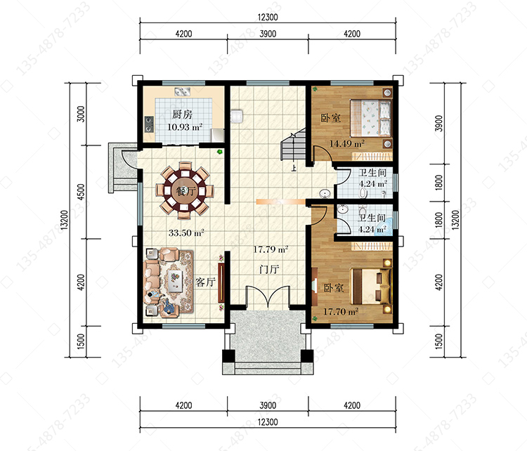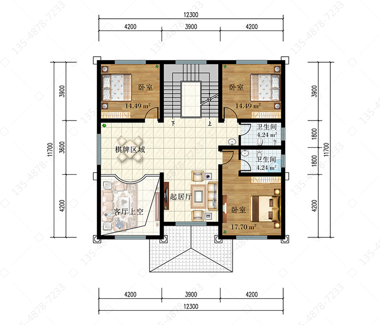 二 层:起居厅、棋牌区域、卧室(附卫生间)、2卧室、卫生间