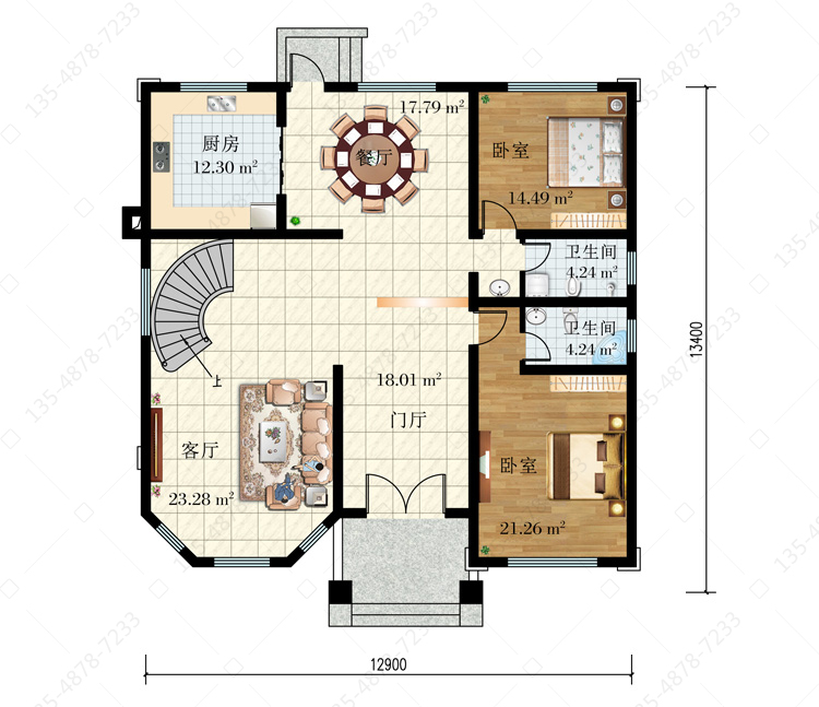 一 层:门厅、客厅(中空)、卧室(附卫生间)、卧室、厨房、餐厅、卫生间