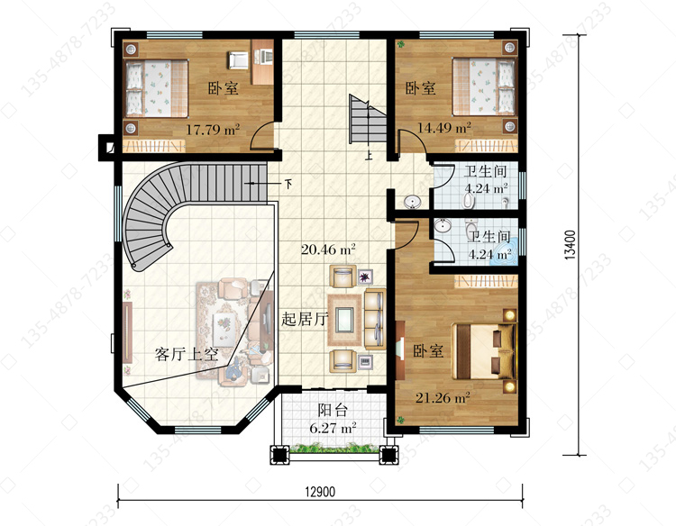 二 层:起居厅、卧室(附卫生间)、2卧室、卫生间、阳台