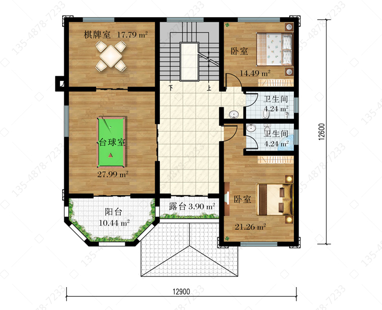 三 层:卧室(附卫生间)、卧室、棋牌室、台球室(附阳台)、卫生间、露台