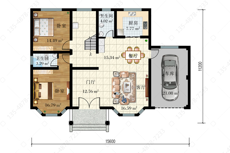 一 层:门厅、客厅、卧室(附卫生间)、卧室、厨房、餐厅、卫生间、车库