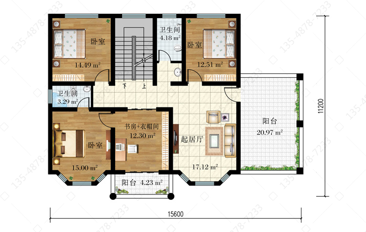 二 层:起居厅、卧室(附卫生间、衣帽间、书房、阳台)、2卧室、卫生间、阳台