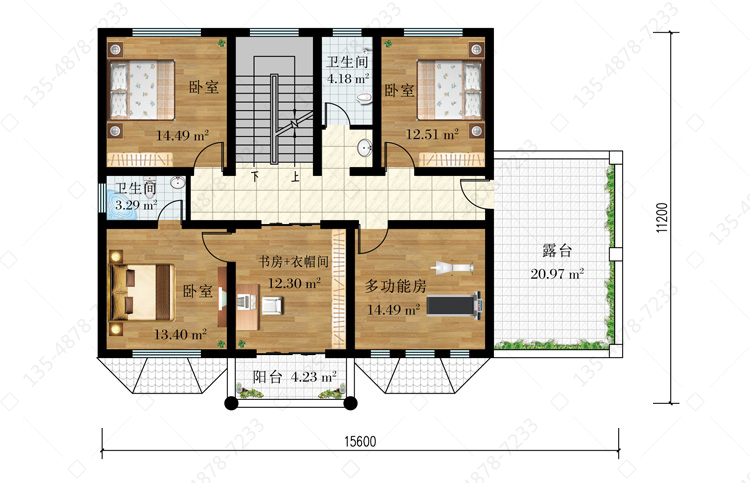 三 层:卧室(附卫生间、衣帽间、书房、阳台)、2卧室、多功能房、卫生间、阳台