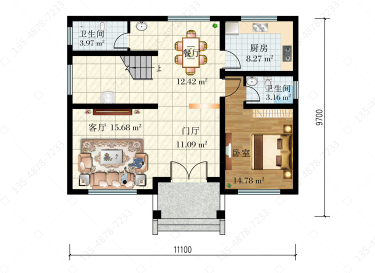 一 层:门厅、客厅、卧室(附卫生间)、厨房、餐厅、卫生间