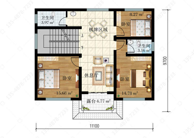 二 层:休息厅、棋牌区域、卧室(附卫生间)、2卧室、卫生间、露台