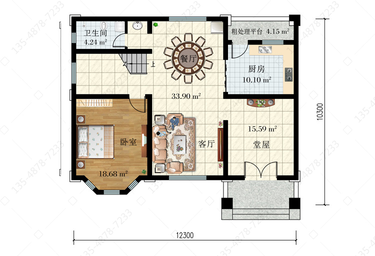 一 层:堂屋、客厅、卧室、厨房、餐厅、卫生间、粗处理平台