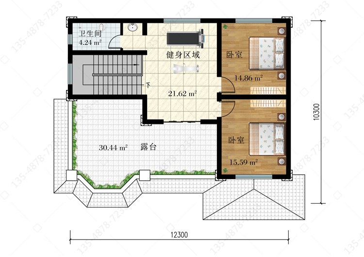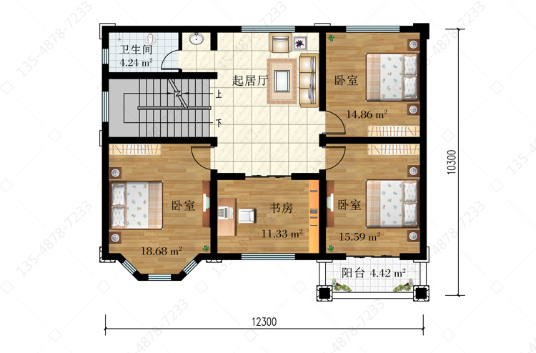 二 层:起居厅、卧室(附阳台)、2卧室、书房、卫生间