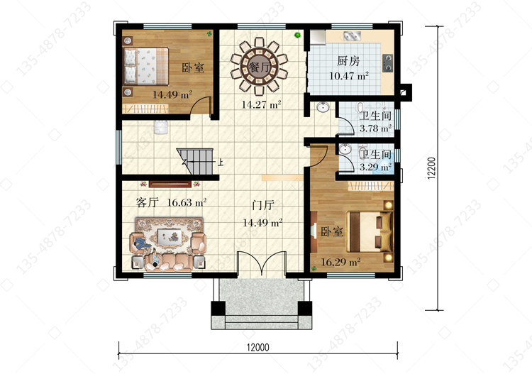 一 层:门厅、客厅、卧室(附卫生间)、卧室、厨房、餐厅、卫生间