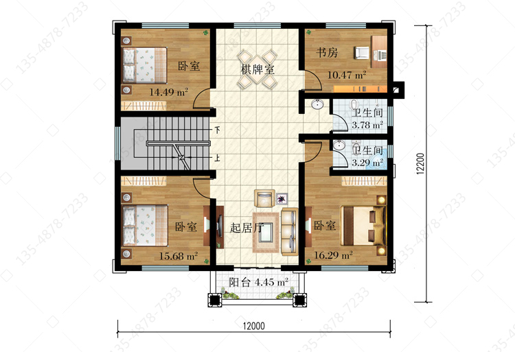二 层:起居厅、棋牌室、卧室(附卫生间)、2卧室、书房、卫生间、阳台