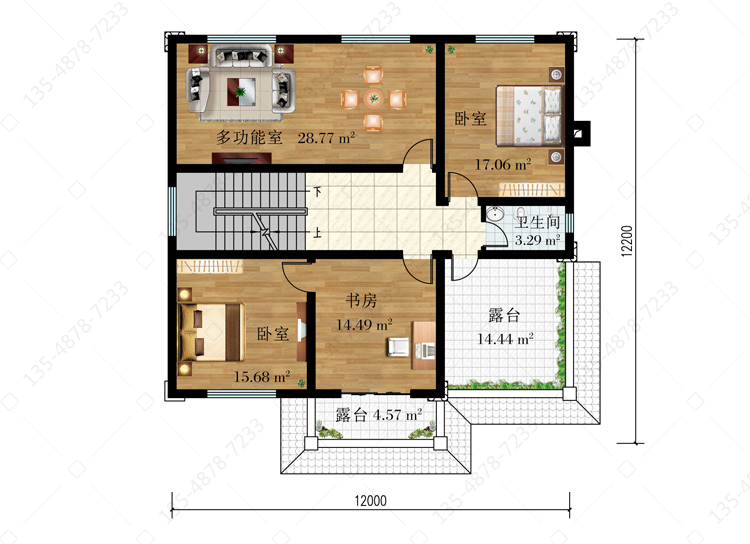 三 层:多功能室、卧室(附书房、露台)、卧室、卫生间、露台