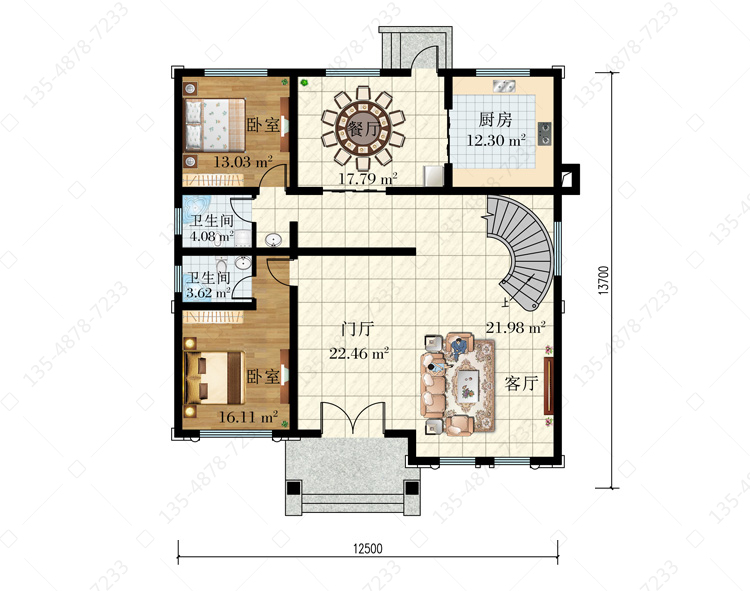 一 层:门厅、客厅(中空)、卧室(附卫生间)、卧室、厨房、餐厅、卫生间