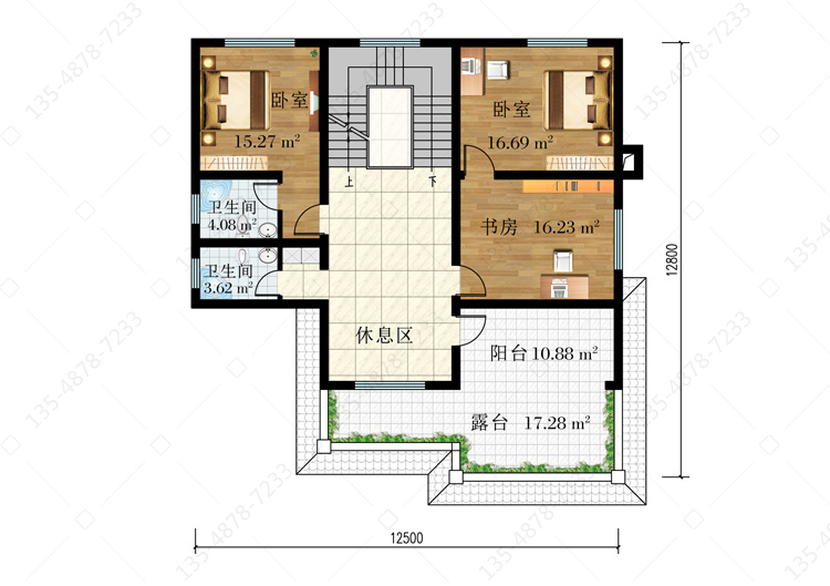 三 层:休息区、卧室(附卫生间)、卧室(附书房)、卫生间、阳台、露台