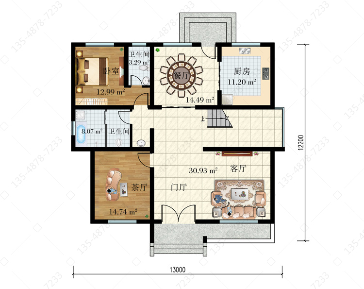 一 层:门厅、客厅、卧室(附卫生间)、茶厅、厨房、餐厅、卫生间