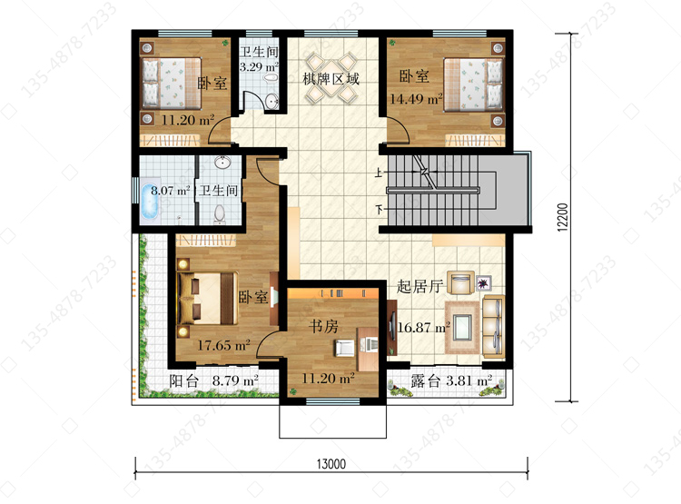 二 层:起居厅、棋牌区域、卧室(附卫生间、书房、阳台)、2卧室、卫生间、露台