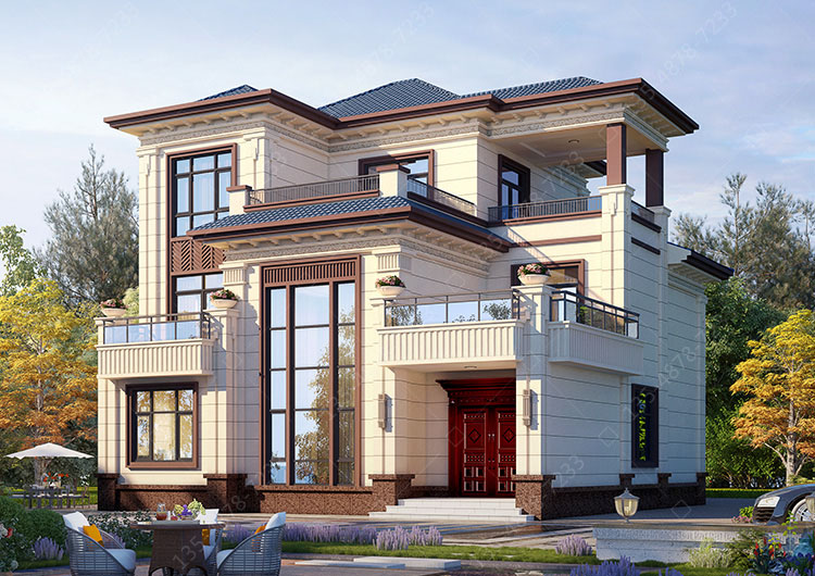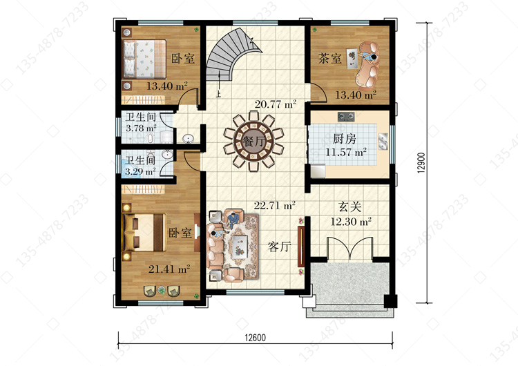一 层:玄关、客厅(中空)、卧室(附卫生间)、卧室、茶室、厨房、餐厅、卫生间