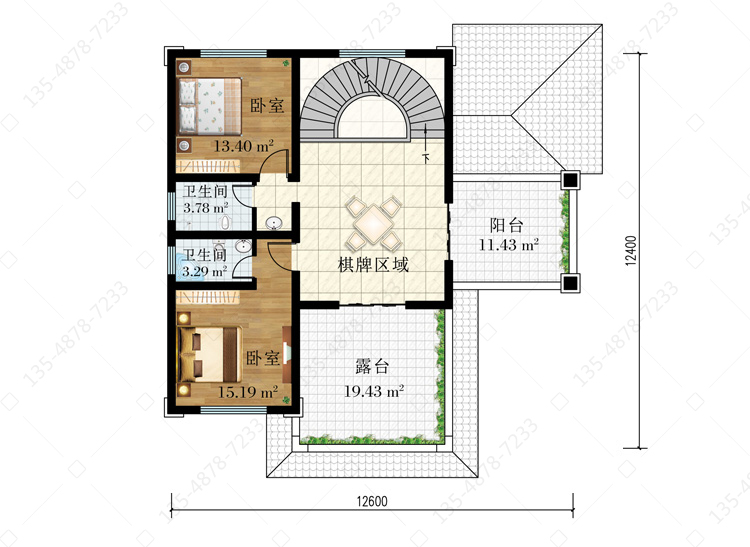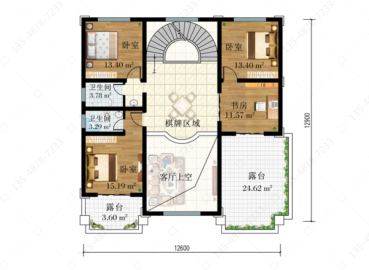 二 层:棋牌区域、卧室(附卫生间、露台)、卧室(附书房、露台)、卧室、卫生间