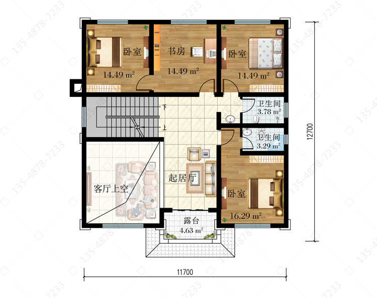 二 层:起居厅、卧室(附卫生间)、卧室(附书房)、卧室、卫生间、露台