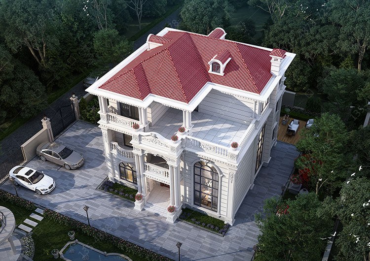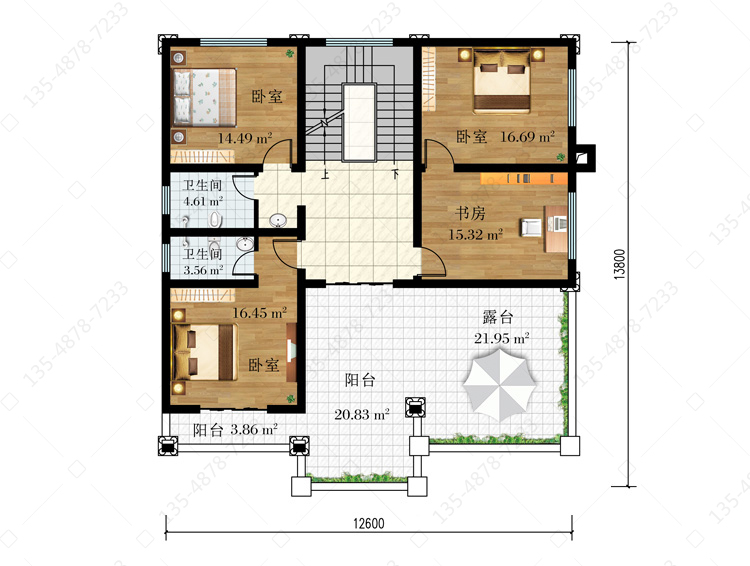 三 层:卧室(附卫生间、阳台)、卧室(附书房)、卧室、卫生间、阳台、露台