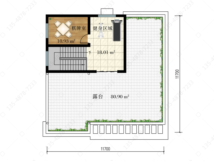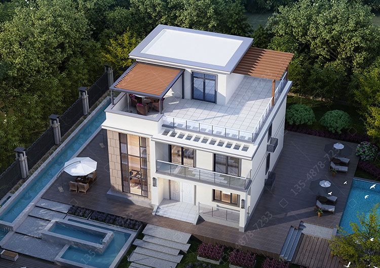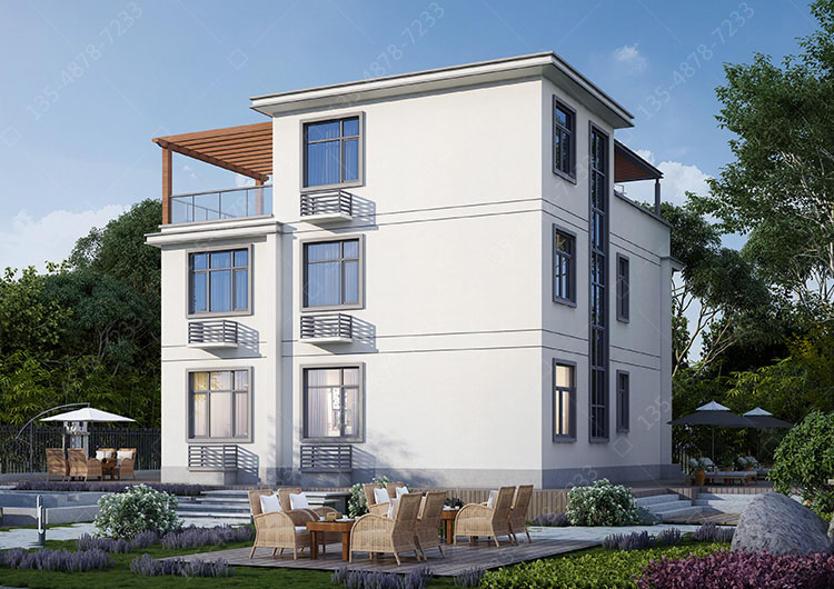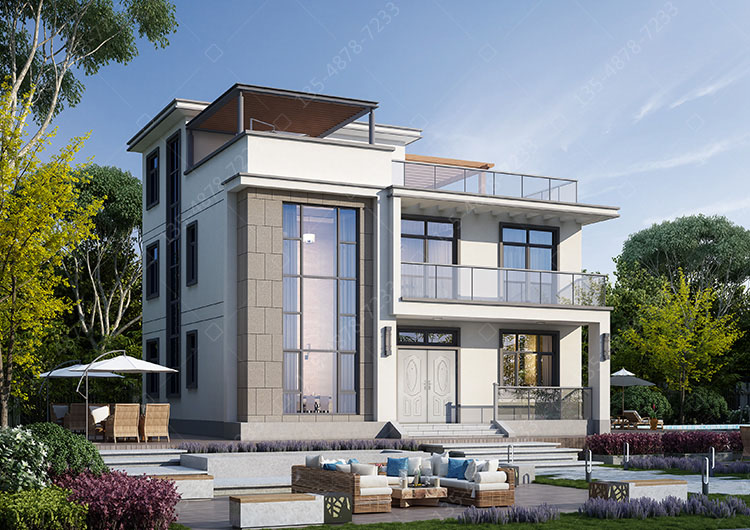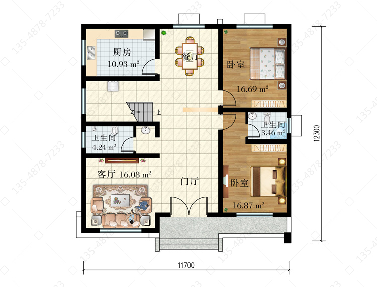 一 层:门厅、客厅(中空)、卧室(附卫生间)、卧室、厨房、餐厅、卫生间