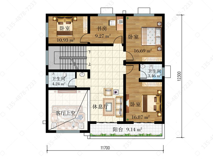 二 层:休息厅、卧室(附卫生间、阳台)、卧室(附书房)、卧室、卫生间、阳台