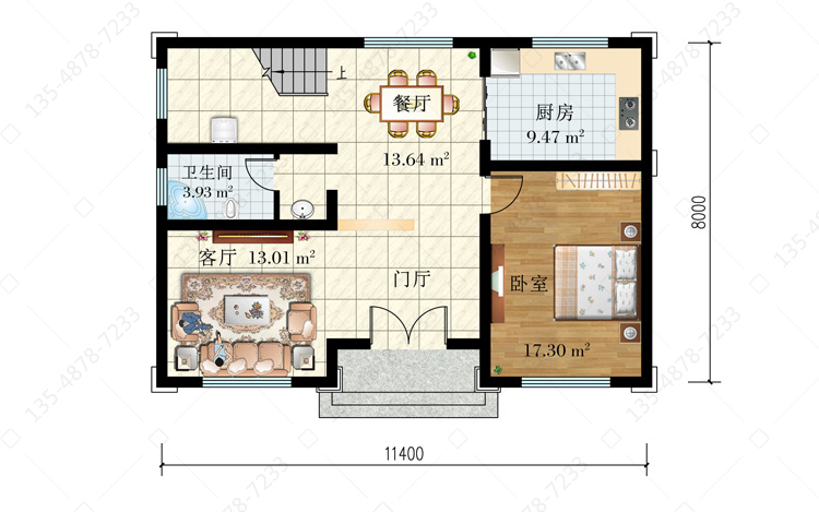 一 层:门厅、客厅、卧室、厨房、餐厅、卫生间