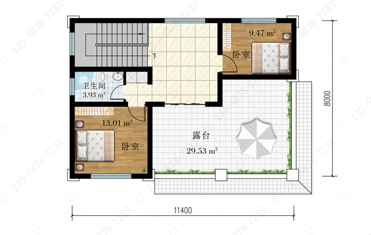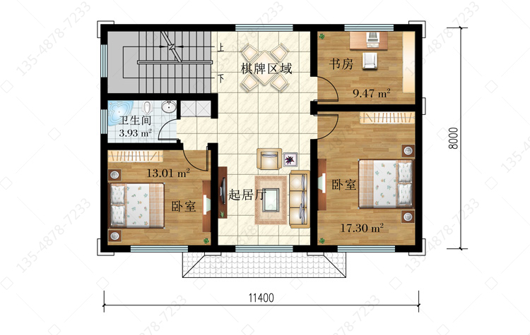 二 层:起居厅、棋牌区域、2卧室、书房、卫生间