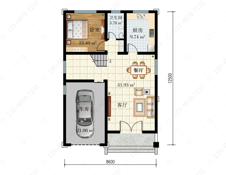 一 层:客厅、卧室、厨房、餐厅、卫生间、车库
