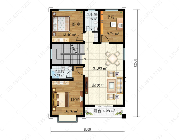 二 层:起居厅、卧室(附卫生间)、卧室、书房、卫生间、阳台