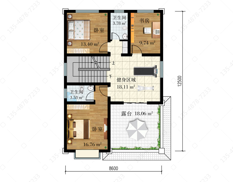 三 层:健身区域、卧室(附卫生间)、卧室、书房、卫生间、露台