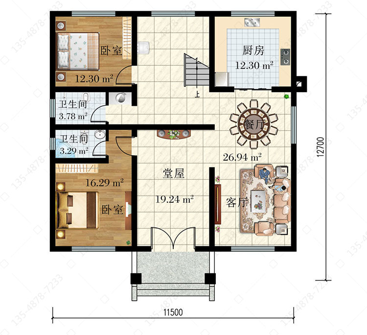 一 层:堂屋、客厅(中空)、卧室(附卫生间)、卧室、厨房、餐厅、卫生间