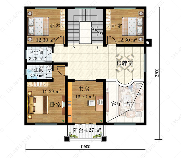 二 层:棋牌室、卧室(附卫生间)、2卧室、书房(附阳台)、卫生间