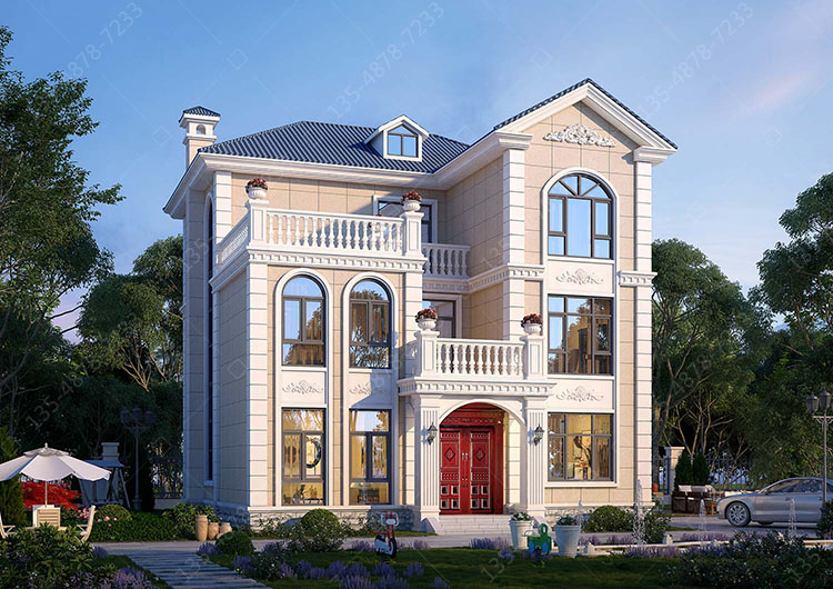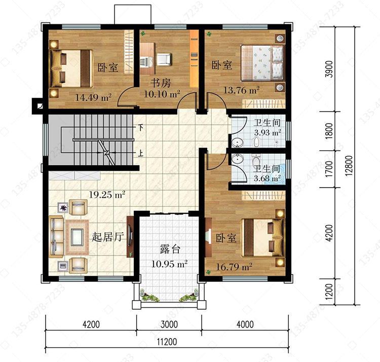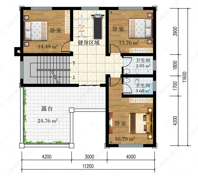 三层农村别墅 层:健身区域、卧室(附卫生间)、2卧室、卫生间、露台